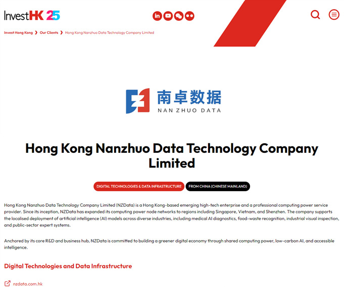 Recently, NZData (Hong Kong Nanzhuo Data Technology Company Limited) has, thanks to its outstanding practices in the fields of digital technology and green economy, simultaneously become a key recommended enterprise by Invest Hong Kong (InvestHK) and a benchmark case in the T-box Upgrade and Transformation Program of the Hong Kong Trade Development Council (HKTDC), drawing significant attention from the industry. As an emerging high-tech enterprise in Hong Kong, NZData takes "shared computing power and low-carbon AI" as its core, and has constructed a global network of computing power nodes covering Singapore, Vietnam, Shenzhen, and other locations. Simultaneously, it provides localized AI model deployment services for diverse scenarios such as medical diagnosis, industrial inspection, and environmental recycling, helping enterprises achieve intelligent transformation at a low cost.